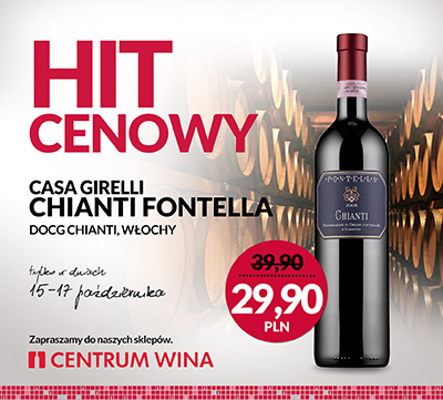 Uniwersalne FONTELLA CHIANTI DOCG CHIANTI do 17 października można kupić w sklepach Centrum Wina w wyjątkowo atrakcyjnej cenie, tylko 29,90 zł za butelkę.