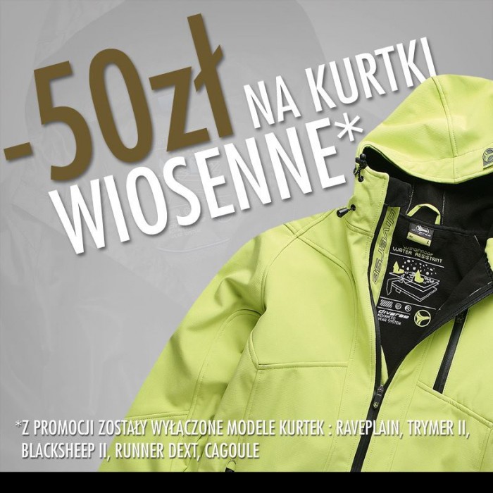 W ramach oferty specjalnej asortyment objęty promocją kupicie 50 zł taniej. Z promocji zostały wyłączone modele kurtek: Raveplain, Trymer II, Blcksheep II, Runne Dext, Cagoule.