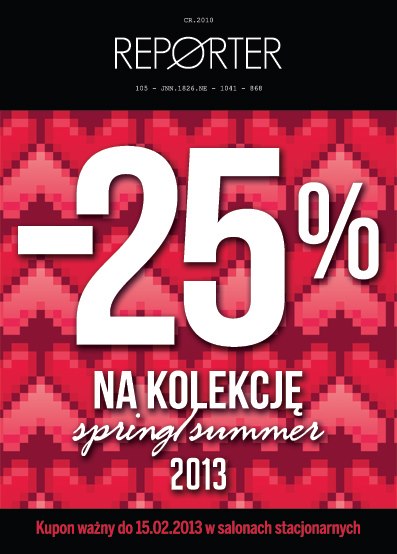 Aby skorzystać z promocji i otrzymać 25% zniżki na zakup nowej kolekcji wystarczy pobrać kupon rabatowy, który dostępny jest na profilu marki Reporter.