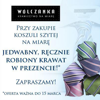 Przy zakupie koszuli szytej na miarę w salonach Wólczanka, jedwabny, ręcznie robiony krawat otrzymasz w prezencie!