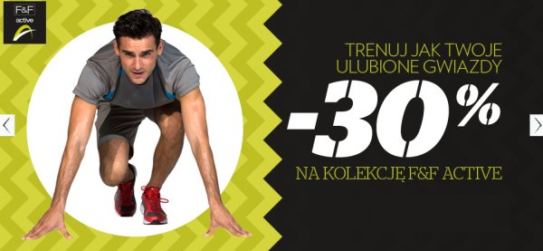 Nieważne czy biegasz w parku, czy ćwicząc na siłowni, dzięki ofercie -30% na kolekcję sportową F&F Active możesz wyglądać stosownie w każdej sportowej sytuacji. Gwiazdy przyłapane podczas treningu wyglądają bardzo stylowo – teraz czas na Ciebie. Wybieraj wśród sportowych T-shirtów, szortów oraz bielizny. Spraw sobie prezent!